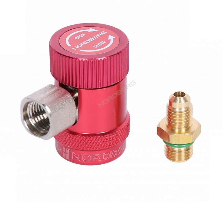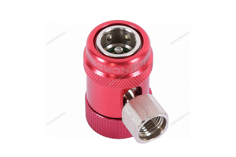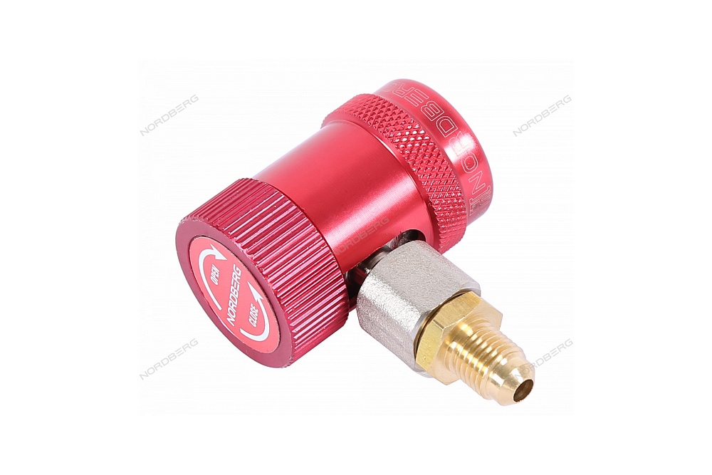 Муфта высокого давления с вентилем быстросъемная красная NORDBERG NFA8H предназначена для подсоединения к порту низкого давления автомобильного кондиционера без открытия доступа к системе циркуляции хладагента.