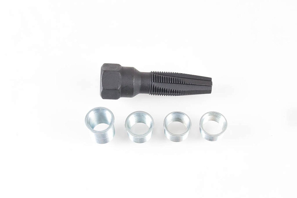 Метчик свечной. 5 предметов В комплекте: 1 - Метчик М14 4 - Футорки: 3/8", 7/16", 5/8", 13/16"
