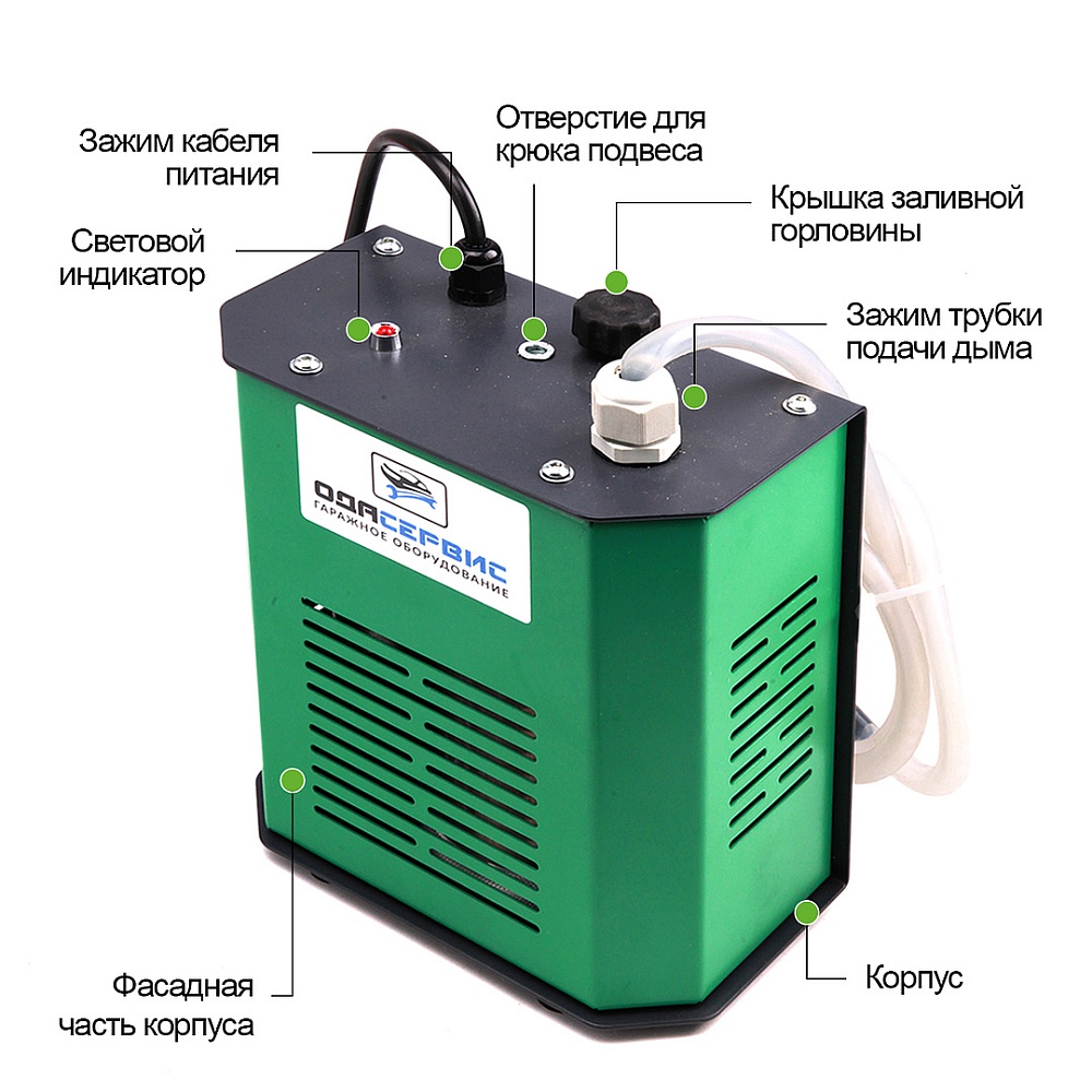 Используется для поиска утечек и негерметичности в объемных полостях узлов двигателя, системы впуска и выпуска, системы охлаждения и других систем путем подачи в них дыма и визуального обнаружения места его выхода.