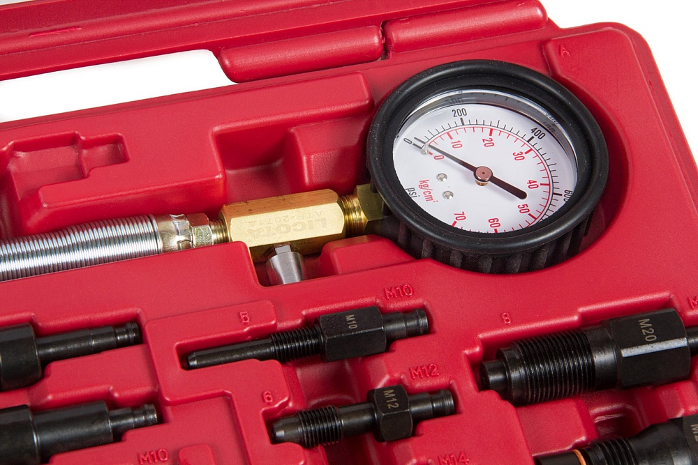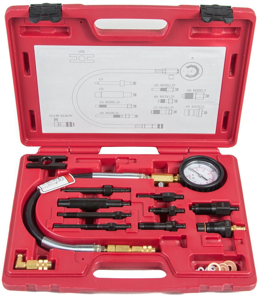 Набор для измерения компрессии дизельных двигателей легковых и легких коммерческих автомобилей с прямым и обычным впрыском. Компрессометр позволяет диагностировать состояние поршневых колец, клапанов и головки блока. В отличии от ATP-2071, шланг манометра оборудован специальным клапаном, что позволяет не учитывать паразитный объем воздуха в шланге, обеспечивая максимальную точность измерений .