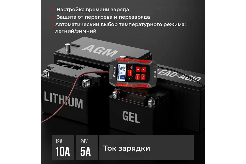 - Подходит для всех свинцово-кислотных АКБ, в том числе АКБ AGM плоские и спиральные, GEL и EFB аккумуляторы для грузовиков, литиевые АКБ, АКБ газонокосилок и другой садовой техники