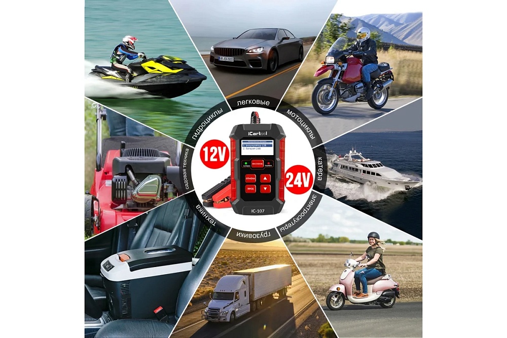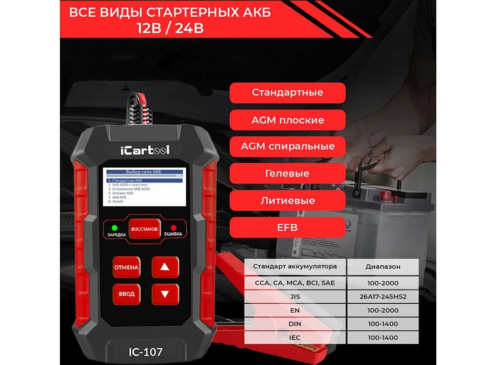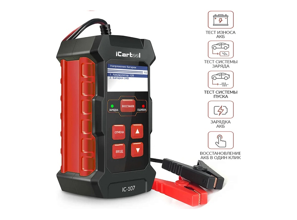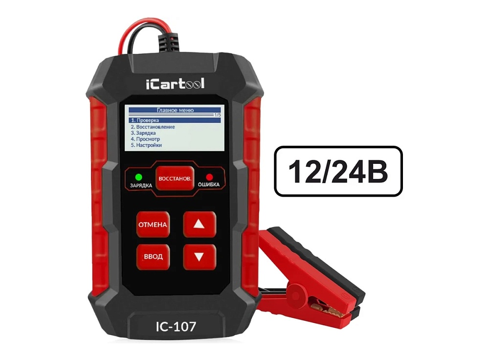 Тестер АКБ iCartool 12/24В с функцией восстановления, зарядное устройство