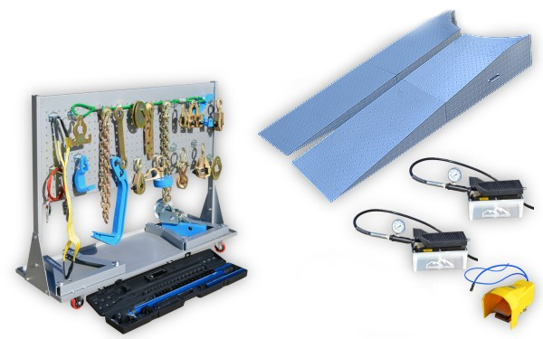 Две силовые стойки (башни) с гидравлическим приводом и тяговым усилием по 10 тонн свободно перемещаются вокруг платформы в пределах 360, что делает возможным приложение тягового усилия к любой точке кузова автомобиля . Высота приложения тягового усилия легко изменяется посредством изменения положения хомута со шкивом.