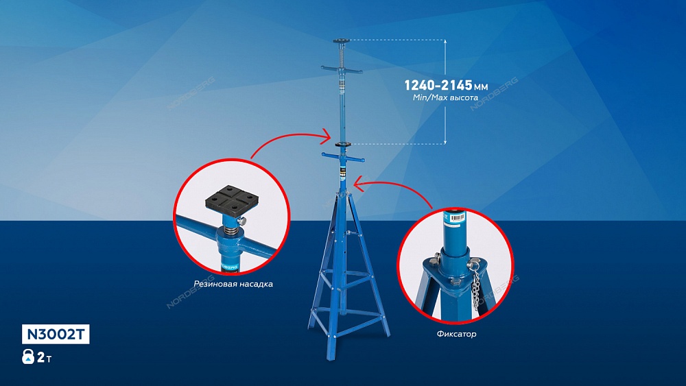 Подставка страховочная, г/п 2т NORDBERG N3002Т предназначена для удержания поднятого автомобиля на заданной высоте для удобства проведения ремонтных работ и страховки во время поднятия
