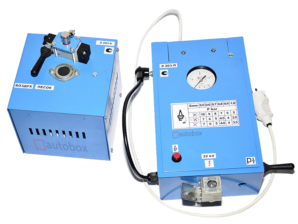 Э203-О - для очистки свечей зажигания. Обеспечивает удаление нагара и других загрязнений на корпусе, тепловом конусе изолятора и электродах свечи при помощи пескоструйной очистки (кварцевый песок 0,14-0,18 мм) и продувки сжатым воздухом .